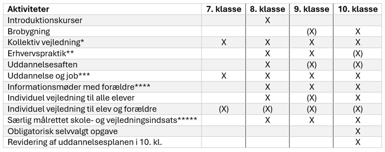 X i tabellen markerer aktiviteter, som er obligatoriske på det pågældende klassetrin, mens (X) markerer aktiviteter, som kan, men ikke skal tilbydes på det pågældende klassetrin.