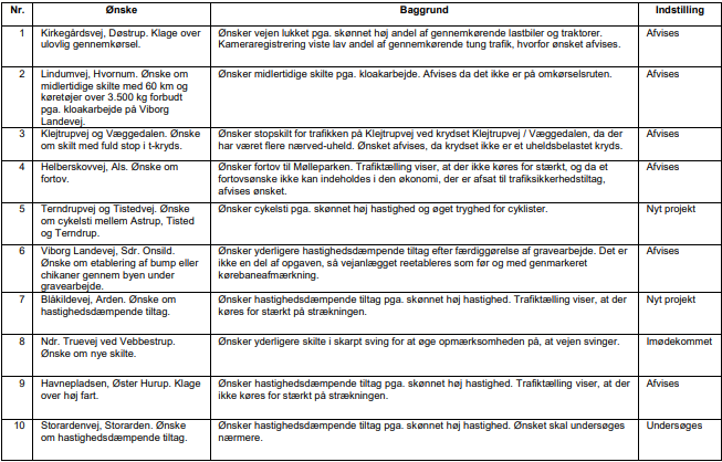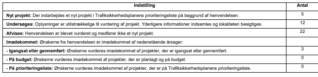 Mariagerfjord Kommune har modtaget 42 nye henvendelser i 2024. For hver henvendelse er angivet, hvordan ønskets status er i Trafiksikkerhedsplanen. For henvendelserne er der udarbejdet en af følgende indstillinger: