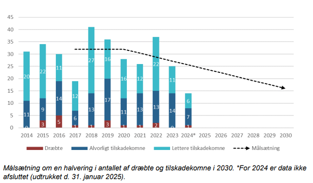 Det betyder, at antallet af dræbte og tilskadekomne højst må være 16 i 2030.